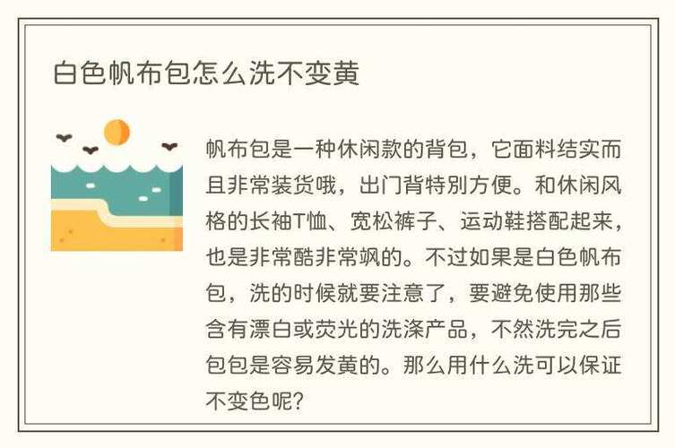〖Five〗、白色帆布包要想洗不变黄,可以采取以下方法:使用水+洗衣粉:如果帆布包不是特别脏,可以使用清水加上适量的洗衣粉进行清洁。将白色帆布包浸入清水中,然后添加洗衣粉并轻轻擦拭清洗。使用柠檬汁:柠檬具有美白效果,可用于清洁白色帆布包。