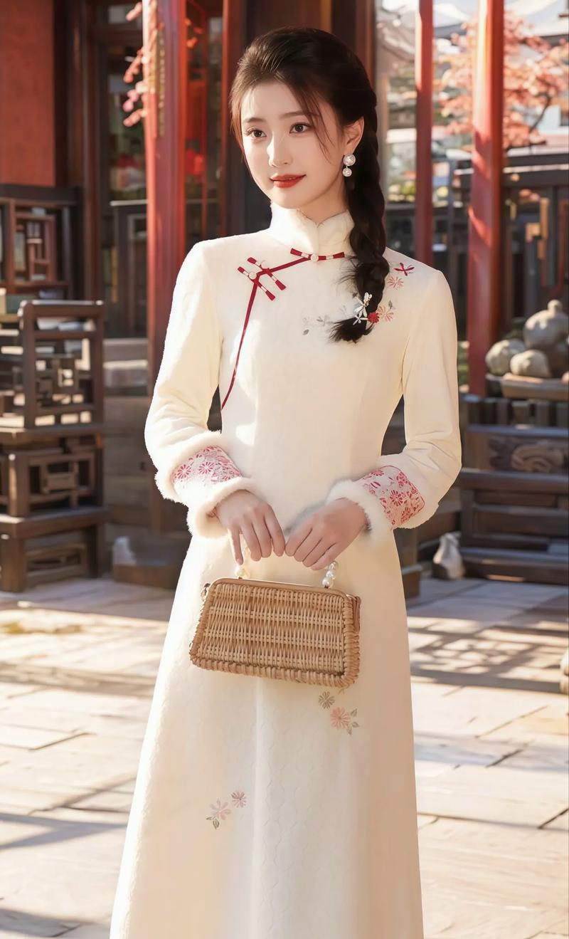 〖Six〗、根据旗袍款式选取搭配 传统旗袍(长款、高领)鞋子:搭配细跟尖头单鞋(裸色/黑色最百搭)或绣花布鞋,显腿长且优雅。外套:春秋可配短款针织开衫或中式短外套;冬季搭长款羊毛大衣或披肩(避免臃肿)。配饰:珍珠项链、玉镯、流苏耳环,低调显贵气。
