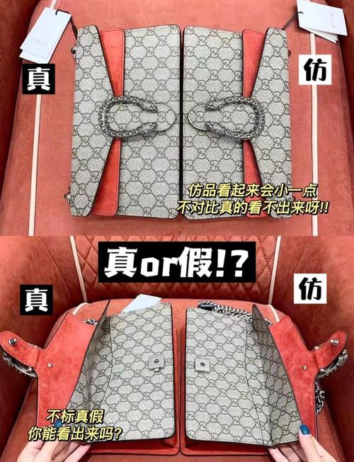 〖One〗、整体外观对比:酒神包的设计走复古风,正品的帆布呈现出自然的黄色调,有一种做旧的复古感,而仿品的帆布颜色偏青。 印花细节:正品的帆布上的老花双G中心点分布无规律,显得更自然。而仿品的点分布有规律,显得较为呆板。 虎头马蹄扣检查:这是酒神包的精髓所在。