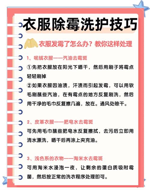 白醋去味法:在清水中加入适量白醋,将衣服浸泡其中半小时左右,之后正常清洗,白醋能有效中和霉味。 柠檬除味法:把柠檬切片放入清水中煮一会儿,待水冷却后,将衣服浸泡进去,柠檬的清香可以掩盖并去除霉味。