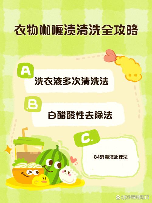 〖Four〗、首先,可以采用白饭加盐的方法。取一小团煮熟的白饭,加入适量粗盐,然后在污渍处揉擦。接着进行正常的洗涤过程。其次,可以将甘油和蛋黄混合后擦拭污渍。待其干燥后,再用清水彻底清洗干净。再者,可以使用浓食盐水与甘油的混合液来去除咖喱渍。将这两种成分混合后,直接涂抹在污渍处,等待一段时间后清洗。