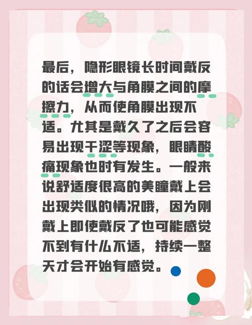 如果是硬性隐形眼镜,初次佩戴者可能会感到异物,适应一段时间即可。如果是软性隐形眼镜,长时间仍有异物感可能是镜片与眼球不匹配,建议去医院检查并考虑更换。休息与适应:如果操作时间过长导致轻微不适感,摘下眼镜休息一段时间,让眼睛适应。