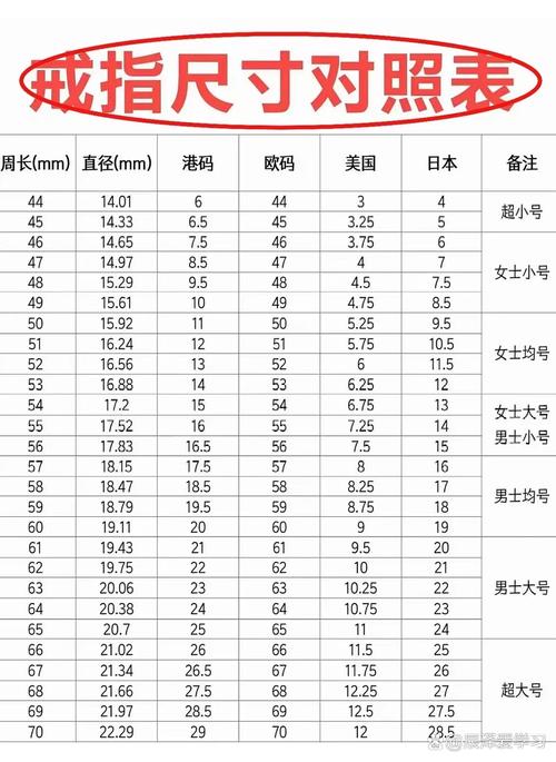 〖Five〗、钻石小鸟戒指尺寸对照表主要基于港式手寸标准,以下是对该对照表的详细解析:手寸定义与表示方法 戒指指圈大小的标准称为手寸,手寸是以“号”来表示的。近来中国多采用港式手寸标准,其对应的直径和周长有固定的对应关系。