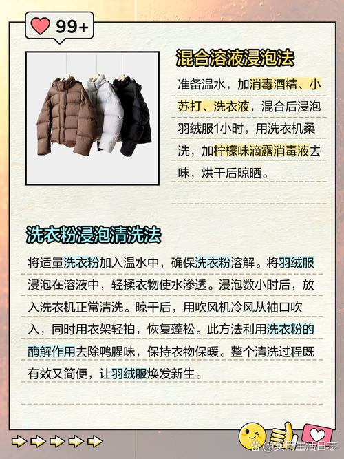 〖Five〗、羽绒服有毛腥味,可以通过手洗的方式进行处理,以消除腥味。以下是具体步骤: 全面充分浸泡 将羽绒服放入20摄氏度左右的温水中,加入适量的洗衣粉或丝毛洗涤剂,并滴入几滴香水。确保羽绒服全面充分浸泡20分钟,以便洗涤剂和香水能够渗透到衣物纤维中,有效去除毛腥味。