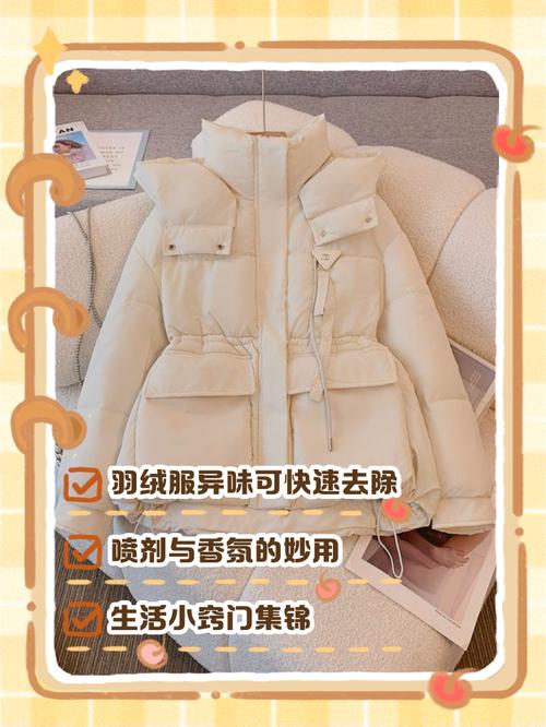 〖Two〗、去除新买羽绒服上的鸭味,可以采取以下几种方法:晾晒与喷洒清香剂:将羽绒服清洗干净并放在太阳下充分晒干。悬挂好羽绒服,使用小木棍轻拍,使羽绒充分蓬松。在晒干后的羽绒服上喷洒清香喷剂,然后继续晾晒,直到衣服内胆完全干透。使用电吹风:用电吹风吹羽绒服,能够快速去除异味。