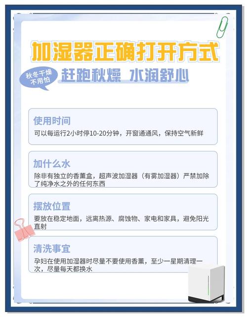 〖Three〗、使用方法 适时使用:在空气特别干燥的时候开启加湿器,但不建议整天一直开着,比较好时停时用。注意事项 水质选取:不能直接加入自来水。自来水中的矿物质可能对加湿器造成损伤,并且会对空气造成污染。建议使用纯净水或经过过滤的水。