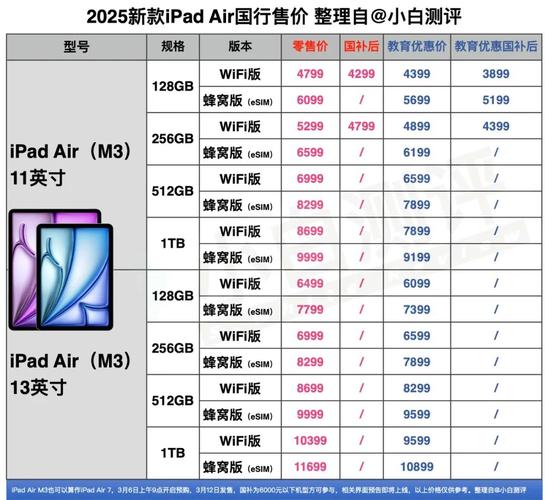 〖Five〗、iPad(第11代/A16)起售价2999元(128GB),性能较前代提升30%,支持eSIM和512GB存储扩展,11英寸屏幕适合娱乐与轻办公,费用亲民,适合追求新机体验的用户。创作者/职场人:推荐iPad Air(M3)。