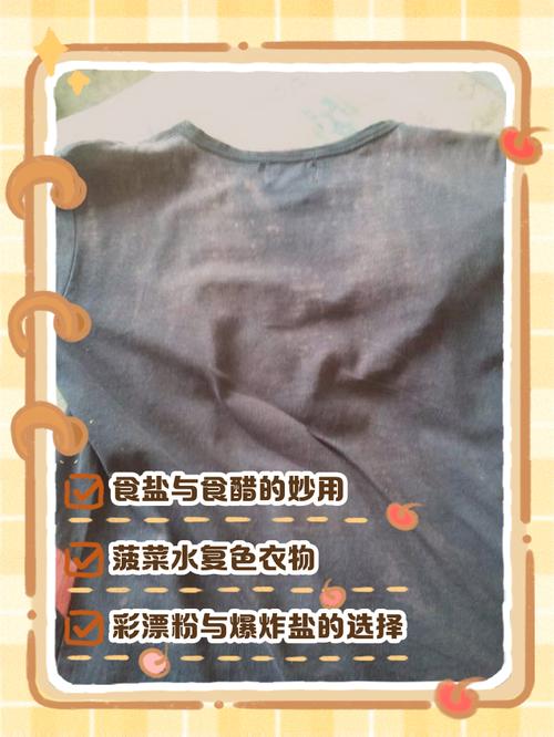 〖Two〗、用盐水浸泡:在清水中加入适量食盐,搅拌均匀后将衣服放入浸泡半小时左右,再用清水洗净。盐水能在一定程度上固色,让衣服颜色更稳定。 使用白醋:往清水中滴入少许白醋,把褪色衣服浸泡其中15 - 20分钟,之后正常清洗。白醋有助于恢复衣服色泽。