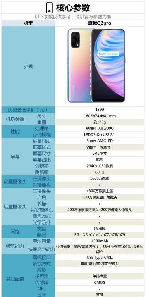 〖One〗、真我Q2 Pro的参数配置详情如下:真我Q2 Pro搭载了一块43英寸的Super AMOLED直面屏,分辨率为24001080像素,屏占比高达90.8%,为用户提供了宽广且细腻的视觉体验。其屏幕支持60Hz刷新率和180Hz触控采样率,确保了流畅的操作感受。