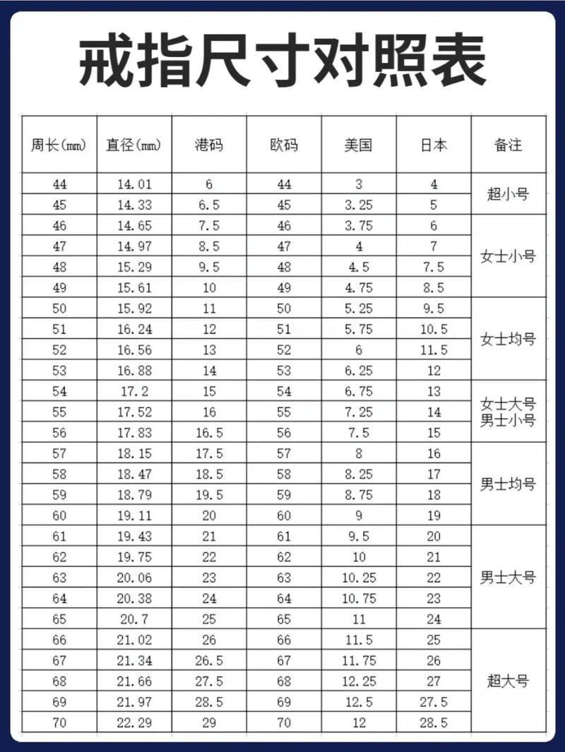 号戒指的内圈周长约为51mm,戒指内直径约为11mm。以下是对戒指尺寸的具体说明:戒指尺寸对照 戒指的尺寸通常按照内圈周长和内直径来划分。以常见的戒指尺寸对照表为借鉴,12号戒指的尺寸属于中等大小,适合大部分女性的手指。尺寸变化规律 周长变化:随着戒指号数的增大,戒指的内圈周长也相应增加。