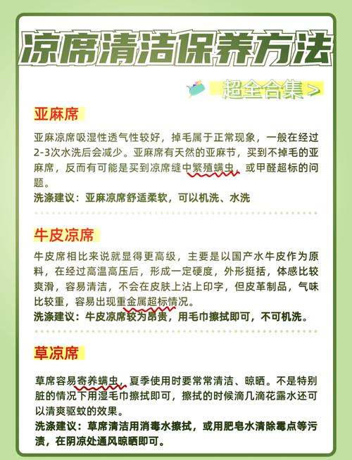 清洗方法: 使用温水与温和清洁剂:将乳胶凉席放入大盆中,加入温水,并加入温和的清洁剂。用手轻轻摩擦、挤压几下,即可将污渍洗去。 避免大力气与长时间泡水:在清洗过程中,注意不要用太大力气搓洗,以免内部开裂。同时,也不能长时间泡水,以免影响乳胶凉席的质地和使用寿命。
