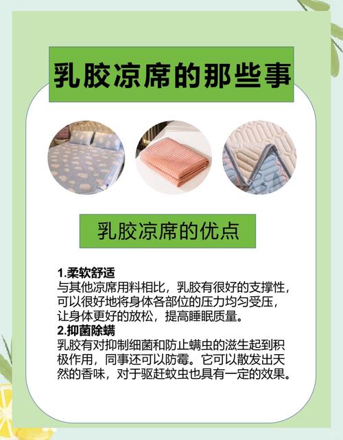 〖Two〗、乳胶凉席的好处包括舒适性好、透气性好、抗菌防螨、耐用性好和环保健康;坏处则有费用较高、重量较大、不易清洗和不适合过敏体质人群。好处舒适性佳:材质柔软,能贴合人体曲线,让人躺感舒适。透气性好:利于空气流通,使人在夏日保持凉爽。抗菌防螨:可有效抑制细菌和螨虫滋生,保障凉席清洁。