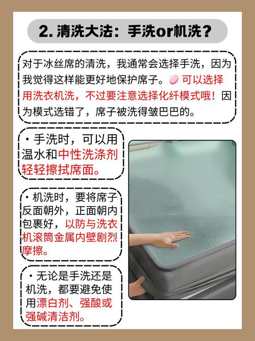 〖Four〗、不同材质的清洗方法 竹席/藤席:温水中加少量中性洗涤剂,软布顺着纹理擦洗,避免暴晒,放阴凉处晾干。 草席:浸泡不超过3分钟,轻刷表面后立即用干毛巾吸去水分,防止霉变。 冰丝席:可机洗但需套洗衣袋,选轻柔模式,水温不超过30℃。