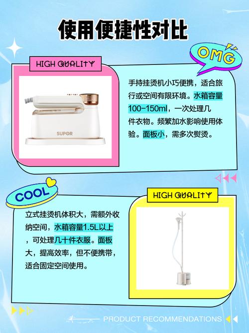 手持挂烫机和挂式挂烫机各有优劣,适合不同场景,需按需选取:手持挂烫机优点:身材小巧,便于收纳,携带方便,适合出差、旅行;操作简单,能随时随地熨烫;可调节烫斗温度和蒸汽量,适配不同材质衣物。