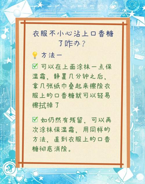 衣服不小心粘上泡泡糖,可以尝试以下几种有效的去除方法。 冷冻法:把粘有泡泡糖的衣服放入冰箱冷冻室,经过一段时间,泡泡糖会变硬变脆。此时取出衣服,用手轻轻揉搓,泡泡糖就会很容易脱落下来。 油类溶解法:在泡泡糖污渍处涂抹适量的食用油,如橄榄油、花生油等。