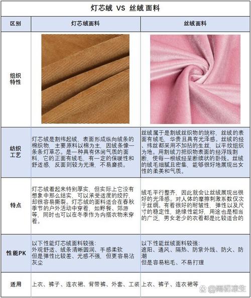 〖Six〗、灯芯绒:质地厚实:灯芯绒的质地厚实,适合制作秋冬季节的服装,保暖性好。手感柔软:其绒条圆润,手感柔软舒适,穿着体验佳。耐磨性强:绒毛耐磨,使用寿命相对较长。金丝绒:手感丝滑:金丝绒的手感丝滑,具有光泽感,适合制作高档服装。有韧性:材质具有一定的韧性,不易破损。
