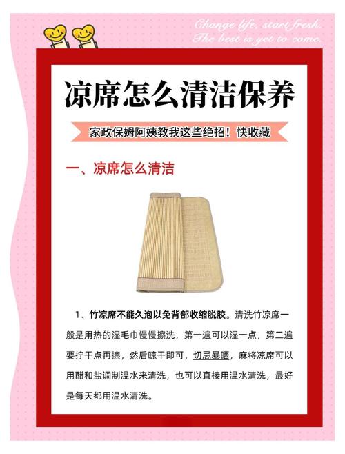 〖Six〗、竹凉席 首先,凉席是不能久泡的,以免背部收缩和脱胶。清洗凉席的一般方法是用热的湿毛巾慢慢擦洗,第一遍可以稍微湿一点,第二遍需要拧干点再擦,最后放在干燥通风处晾干就可以了。切忌不要曝晒。麻将凉席 可以用醋和盐调制温水来清洗,也可以直接用温水清洗即可。