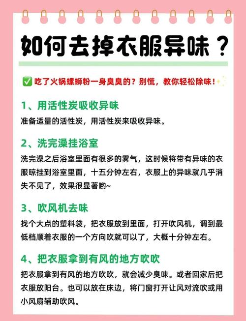 〖Three〗、方法一:重新清洗并加白醋。将衣服在清水中漂洗几次,去除部分异味。然后在盆中加入适量清水,倒入约100毫升白醋,搅拌均匀后将衣服浸泡15到20分钟,白醋能有效中和臭味。之后正常漂洗晾干。方法二:用柠檬汁浸泡。榨取新鲜柠檬汁,在一盆清水中加入柠檬汁,把有臭味的衣服浸泡其中30分钟左右。