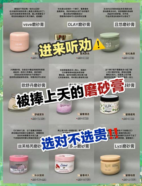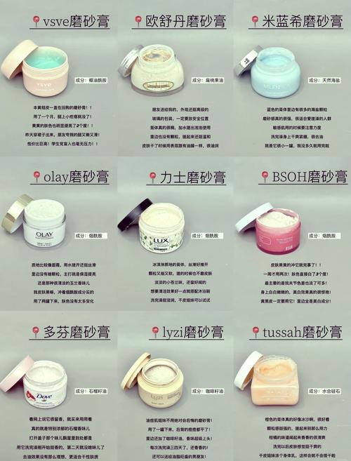 〖Three〗、面部磨砂膏和身体磨砂膏的使用方法如下:面部磨砂膏: 取量:取拇指大小的面部磨砂膏。 涂抹:均匀涂在肌肤上,注意要避开眼睛周围。 按摩:双手以由内向外画小圈的动作轻揉按摩,鼻窝处改为由外向内画圈。 持续时间:按摩持续510分钟。身体磨砂膏: 沐浴准备:沐浴时先沾湿身体。