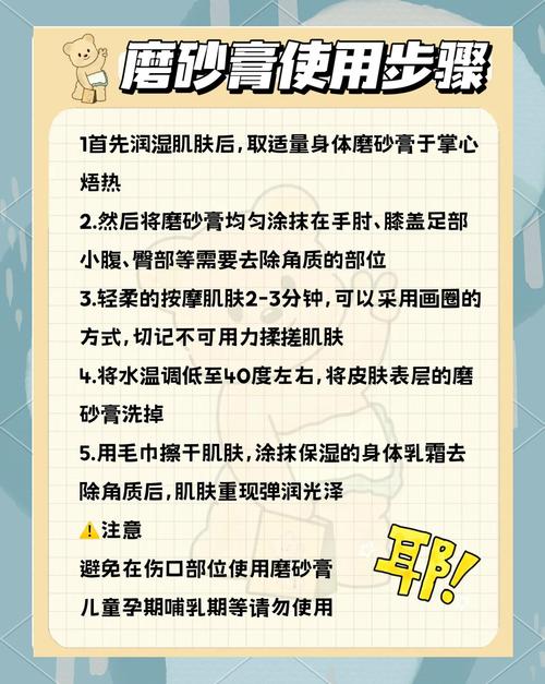 〖Five〗、磨砂膏应该在洗澡时使用,且在沐浴露之前使用。以下是正确的洗澡顺序及磨砂膏的正确使用方法:正确的洗澡顺序 先用磨砂膏:在沐浴时,先打湿身体,然后取适量磨砂膏涂抹于身体部位,以双手按摩的方式轻轻涂抹于全身,特别是需要去角质的部位。注意力度要轻柔,避免过度摩擦导致皮肤受伤。