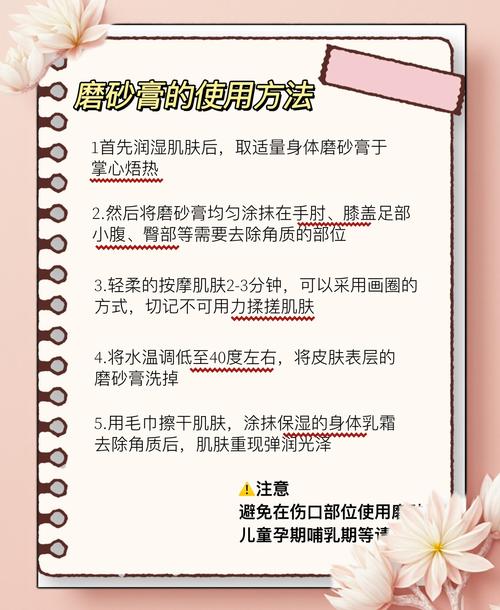 〖One〗、身体磨砂膏的正确使用方法如下:润湿肌肤并取适量磨砂膏:在使用身体磨砂膏前,先润湿肌肤。取适量身体磨砂膏于掌心,并焐热使其更容易涂抹。均匀涂抹并轻柔按摩:将磨砂膏均匀涂抹在手肘、膝盖、足部、小腹、臀部等需要去角质的部位。