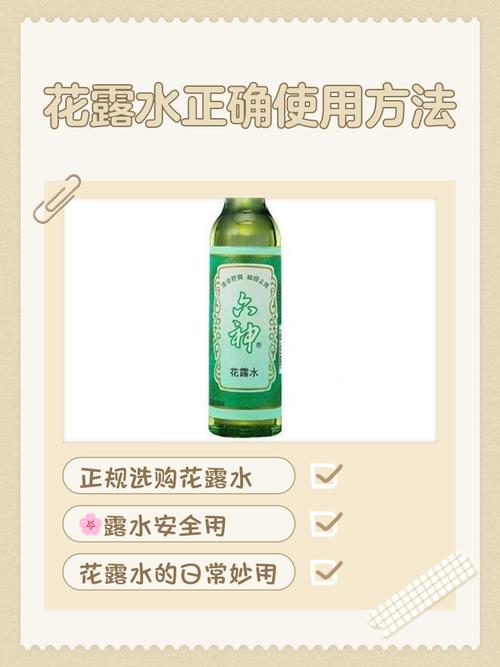 使用花露水时,首先需要稀释。因为花露水的成分较为刺激,直接涂抹在皮肤上可能会引起过敏反应或刺激皮肤。可以将花露水按照1:1的比例加入温水中稀释后使用,也可以先将其喷在手上,再涂抹在身体需要缓解的部位。使用花露水时要注意适量,过量使用可能会对皮肤造成刺激或引起过敏反应。一般来说,每次使用适量即可,不建议大量涂抹。
