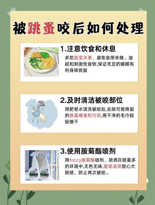 〖Three〗、防止跳蚤咬人的方法如下:使用杀跳蚤气雾剂:在可能藏匿跳蚤的区域喷洒标明可以杀跳蚤的气雾剂。地板消毒:用沸腾的开水浇洒地板,以消灭可能存在的跳蚤及其卵。使用姜黄粉:在有跳蚤的床或椅子上涂抹姜黄粉,或者在衣物袋中放置姜黄粉香包,使衣物沾染姜味,以此驱赶跳蚤。