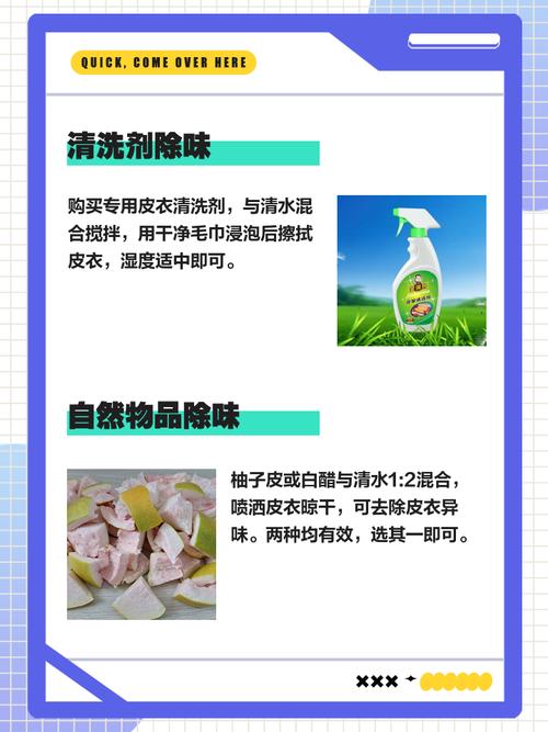 〖One〗、定期翻动:每隔一段时间翻动一下皮衣,确保每一面都能充分接触空气,加速异味的散发。时间控制:一般晾晒2『3』天即可有效去除大部分异味。如果异味较重,可以适当延长晾晒时间,但要注意不要超过一周,以免皮革过于干燥。 食醋去味法 准备材料:取适量的食醋(白醋效果更佳),不需要稀释。