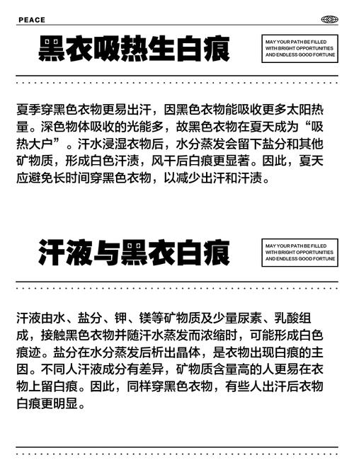 〖One〗、衣服出汗后出现白色痕迹,主要是汗液中的成分所致。汗液里除了水分,还含有盐分等矿物质。当身体出汗时,汗液附着在衣服上,随着时间推移,其中的水分会逐渐蒸发。而盐分等矿物质不会随着水分一起蒸发,就会残留在衣服上,形成白色的痕迹。尤其是在大量出汗或者所处环境温度较高、空气干燥时,水分蒸发速度加快,白色痕迹会更加明显。