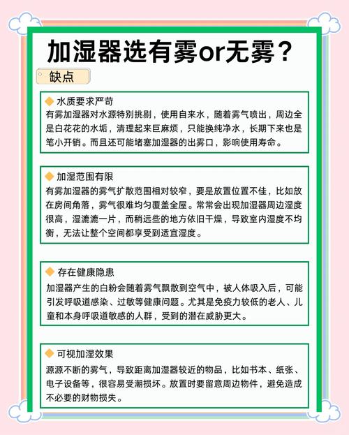 冷雾加湿机更为适宜。热雾加湿机的运作原理是利用电热元件将水加热至沸腾,从而产生蒸汽进行加湿。 这种方式类似于家中烧水时产生的蒸汽。而冷雾加湿机则不同,它的工作原理是通过电子高频震荡,利用陶瓷雾化片的高频谐振来打散液态水分子,生成自然飘逸的水雾,无需加热也不需要添加任何化学物质。