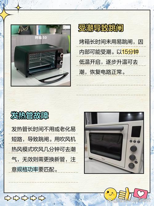 发热管受潮:长时间未使用的烤箱,其发热管可能因受潮而导致绝缘性能下降,使用时可能引起跳闸。解决方法可以是断开地线,让烤箱加热半小时以去除潮气,然后再接回地线。家庭电路故障:家庭电路老化或者存在其他大容量用电器具与烤箱同时使用,可能引起电路超负荷而跳闸。