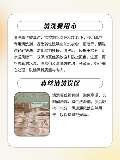 〖Three〗、蚕丝被套的洗涤需要特别小心,建议使用30度以下的冷水手洗,避免使用洗衣机。深色的蚕丝被套比较好单独洗涤以防止染色。洗涤时应选用温和的酸性或中性洗涤剂,浸泡时间不宜过长。洗后应自然晾干,避免阳光直射。对于熨烫,使用110度以下的低温熨斗并垫上布料,以防损坏。