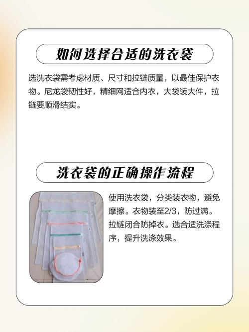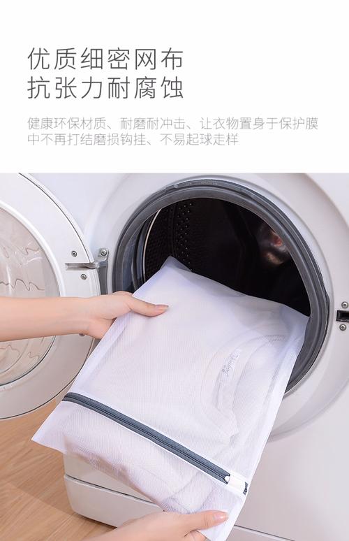 〖Three〗、洗衣袋的正确使用方法:选取合适的洗衣袋:根据衣物的大小和材质选取合适的洗衣袋,一个洗衣袋内通常放置1~3件衣服,以确保衣物有足够的空间在袋内翻动。正确装入衣物:在洗衣服之前,将衣物整齐地装入洗衣袋中,拉上拉链或系好封口,避免衣物在洗涤过程中从袋中脱出。