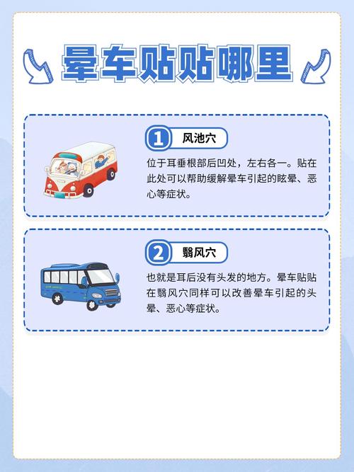 晕车贴是出行时防止晕车的一种有效方法。它可贴在肚脐上,或贴在耳后的扶风穴,左右耳各一片。建议在坐车前1小时贴上,每6小时更换一次。晕车贴的主要成分是防风、冰片、肉桂、乳香等,这些成分具有提神醒脑的功效,可以预防晕车,并缓解因晕车导致的头晕、恶心、呕吐等症状。