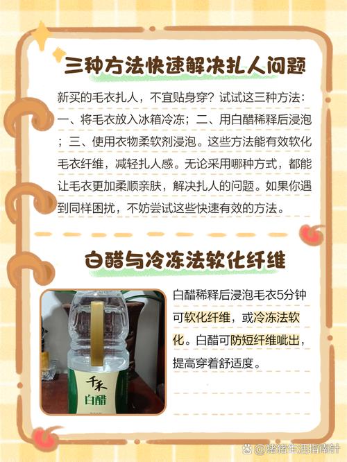 〖Two〗、使用白醋、润发乳和冰箱冷冻:- 将毛衣浸泡在加入少量白醋的冷水中,软化纤维并减少扎感。- 涂抹润发乳,增加毛衣的柔软度。- 晾干后,将毛衣放入冰箱冷冻,冰冻一晚后取出,毛衣将不再扎人。 清洗时使用衣物柔顺剂:- 清洗扎人的毛衣时加入衣物柔顺剂,使毛衣变得柔软。