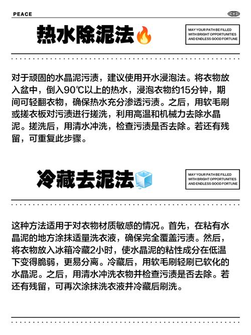〖Three〗、温水+洗衣液大法:先把衣服脱下来,别急着搓揉哦。把它放进温水里泡几分钟,让衣服和水晶泥都放松放松。然后,倒点洗衣液进去,再泡一会儿,让洗衣液和水晶泥来个“友好交流”。浸泡完成后,拿出个软刷子,轻轻地、温柔地把水晶泥刷掉。