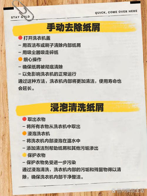 〖One〗、如果在洗衣服的过程中卫生纸没有及时掏出,导致纸屑沾满了整缸衣物,那么在衣服干燥后去除纸屑可能会比较困难。一种解决方法是将衣物在阳光下晾干。一旦衣物干燥,可以将衣物翻转,露出内侧,然后用手轻轻拍打,使纸屑脱落。如果纸屑分布较广且难以处理,可以使用软毛刷轻轻刷去衣服上的纸屑。