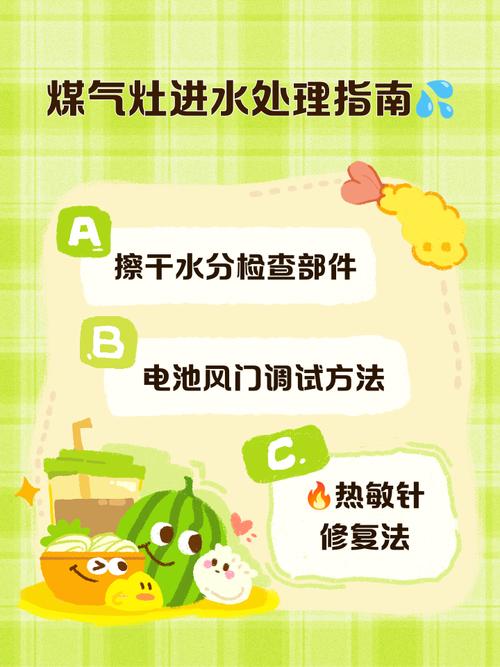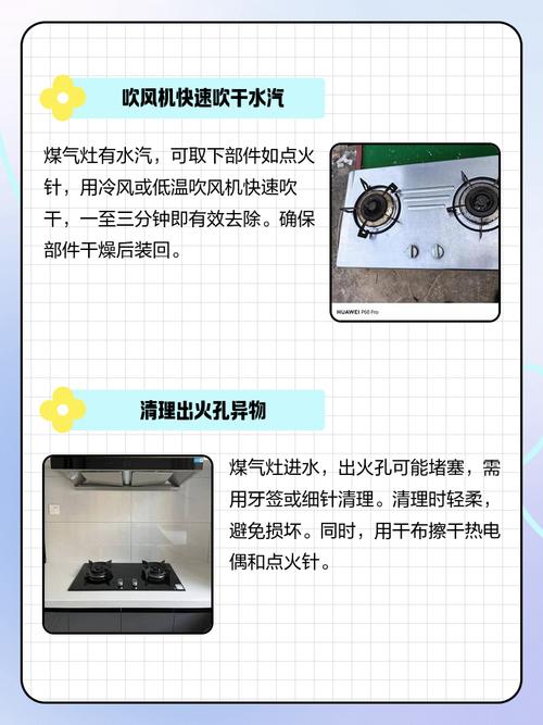 因此,一旦发现燃气灶进水,应立即采取相应措施进行处理,包括擦干电源开关、灶眼及其充电电池里的水分,用干毛巾伸入燃气灶内部擦洗,并使用电吹风或其他能制风的机器对着燃气灶口吹,以烘干水分。这些步骤可以最大程度地减少水分对燃气灶的损害,确保使用的安全性。