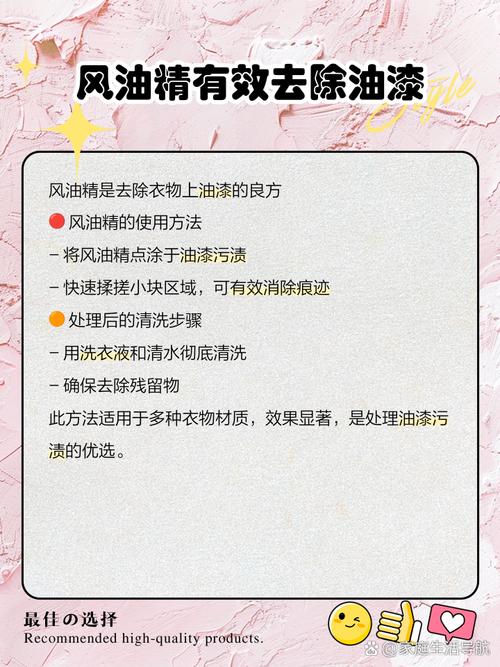洗掉衣服上的油漆,可以尝试以下几种最佳方法:使用橄榄油:步骤:将橄榄油涂抹在油漆处,轻轻搓几下,让橄榄油充分浸透油漆,等待几分钟后,用肥皂清洗。优点:橄榄油可以避免伤手,同时有效去除油漆。使用花露水:步骤:将花露水涂在沾有油漆的位置,等待片刻后,用肥皂进行清洗。