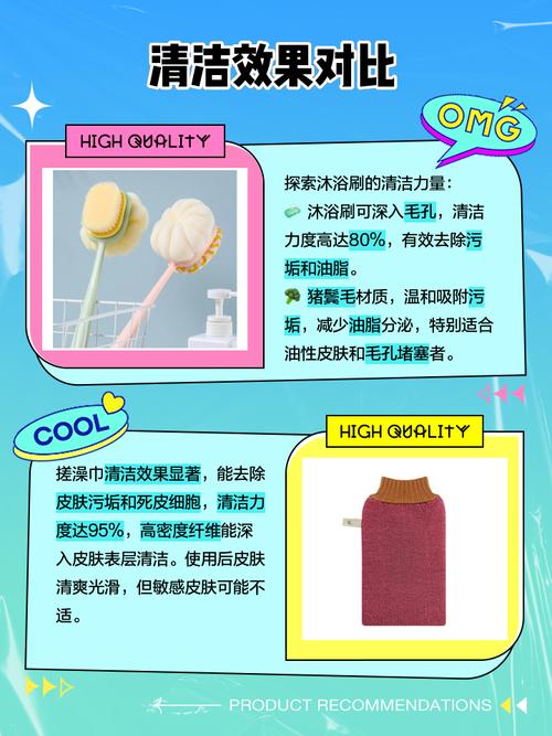 我个人认为,沐浴刷更适合日常清洁使用,它不仅能温和地去除皮肤表面的污垢,还能帮助去除角质,使肌肤更加光滑细腻。而搓澡巾更适合偶尔深度清洁,或者是在去角质时使用。对于那些皮肤较为敏感的人来说,沐浴刷无疑是一个更好的选取。当然,这并不意味着搓澡巾毫无优点。在某些情况下,比如需要深层清洁或是去角质时,搓澡巾依然是一个不错的选取。