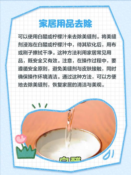 酒精:酒精能溶解部分美缝剂成分。将酒精倒在污渍处,用软布轻轻擦拭,美缝剂会逐渐溶解,之后再用清水漂洗干净。 白醋:白醋呈酸性,对美缝剂有一定的分解作用。把白醋涂抹在沾有美缝剂的地方,静置几分钟,然后揉搓,能有效去除污渍,最后用清水洗净。 香蕉水:香蕉水去除顽固污渍效果较好。