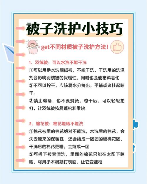 〖Four〗、清洗大被子的方法如下:使用被套:为被子加上一个被套,这样可以有效保护被子,同时方便清洗,特别是鹅毛、羽绒被、丝绵被等贵重材质。准备洗涤液:将被套翻过来,因为日常杂物通常积压在角落。烧好开水,倒入桶内,加入洗衣粉,浸泡五分钟后使用。