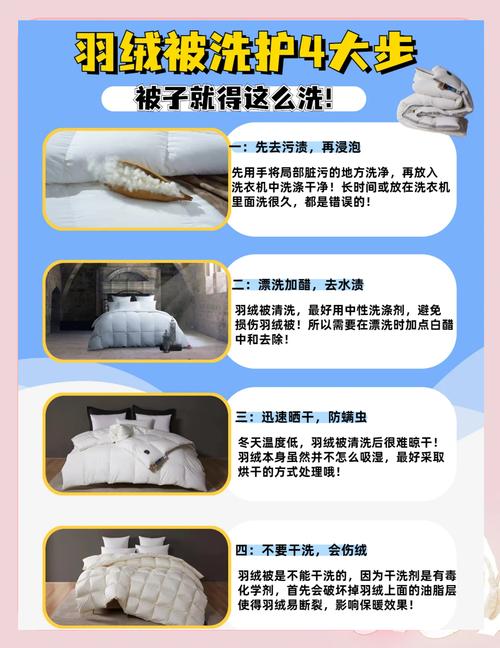 〖One〗、预处理:先将羽绒被放入大容器中,加入温水和适量的洗涤剂,轻轻搅拌,让被子浸泡一段时间。 清洗:使用温水和中性洗涤剂(避免使用漂白剂)轻轻搓洗被子,避免过度摩擦。 漂洗:用清水反复漂洗,直到洗涤剂完全清除干净。 脱水:将被子放入洗衣机中进行轻柔的脱水,注意不要过度脱水,以免羽绒发生变形。