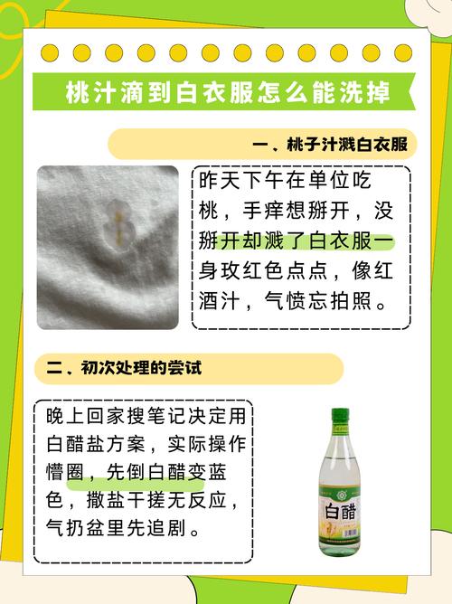 〖One〗、如果不慎将桃子汁弄到白衣服上,首先可以涂抹深层洁净洗衣液在污渍处,让其静置一段时间,再进行正常清洗。这种方法适用于污渍不严重的情况。 另一种方法是使用浓盐水。将盐和水混合,制成浓盐水,然后涂抹在桃子汁污渍上,轻轻搓洗。之后再用水冲洗,并加入适量洗涤剂进行清洗,以去除桃子汁。