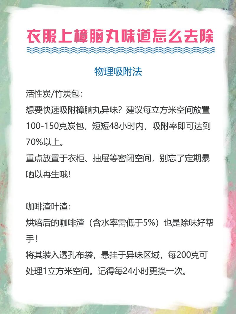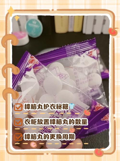 〖Four〗、放置位置:樟脑丸应放在衣柜的角落,与衣服保持一定距离,避免直接接触。数量控制:每个衣柜里大约放23个樟脑丸即可,根据衣柜大小适当调整。定期通风:衣柜应每12周通风一次,以消散樟脑丸的味道并换气。晾晒衣物:每隔2周左右将衣柜中的衣服拿到外面晾晒,以避免樟脑丸味道残留,同时起到杀菌作用。