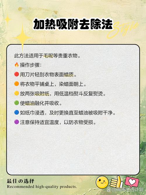 〖One〗、衣服滴了蜡油,可以采取以下几种方法进行处理:热水处理法:融化去除:由于蜡烛油在40度左右会融化,因此可以使用热水将蜡烛油浸入衣服中,从而轻松去除。也可以将热水浇在滴有蜡烛油的地方,使其融化。纸覆盖法:在滴有蜡烛油的地方覆盖一张纸,然后轻轻按压,有时蜡烛油会粘附在纸上,从而被去除。