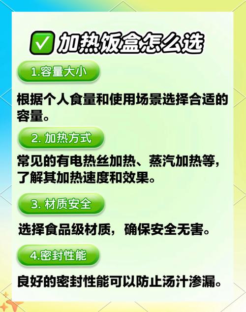 使用方式 用户在使用电热饭盒时,应当按照产品说明进行操作。一些电热饭盒具备自动保温功能,在达到设定温度后会自动断电,避免长时间加热影响食物口感和营养。饭盒的品牌和质量 不同品牌的电热饭盒在性能上存在差异,优质产品的加热效率更高,更加节能和安全。因此,品牌和质量也会影响加热时间。