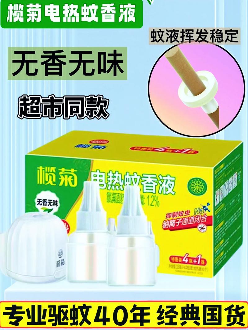 榄菊电蚊香液:榄菊成立于1982年,是一款专业杀虫品牌。这款电蚊香液植物提取,无香、无味、无刺激,不含避蚊胺。费用大约在29元左右/两瓶装。 超威电蚊香液:超威电蚊香液味道为艾草清香型,安全有效,气味清新。采用氯氟醚菊酯复配方,能有效驱蚊,符合国家标准,安全有保障。