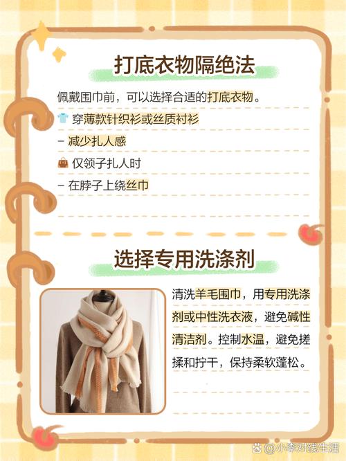 〖Three〗、羊毛围巾扎脖子的解决方法主要有以下几种:佩戴丝巾在戴羊毛围巾之前,可以先戴一条丝巾。这样可以有效隔绝羊毛围巾与皮肤的直接接触,从而避免扎人的感觉。同时,丝巾与围巾的搭配还能增添整体穿搭的层次感和时尚感。选取丝巾时,注意与围巾的颜色和款式相协调,以达到最佳的视觉效果。