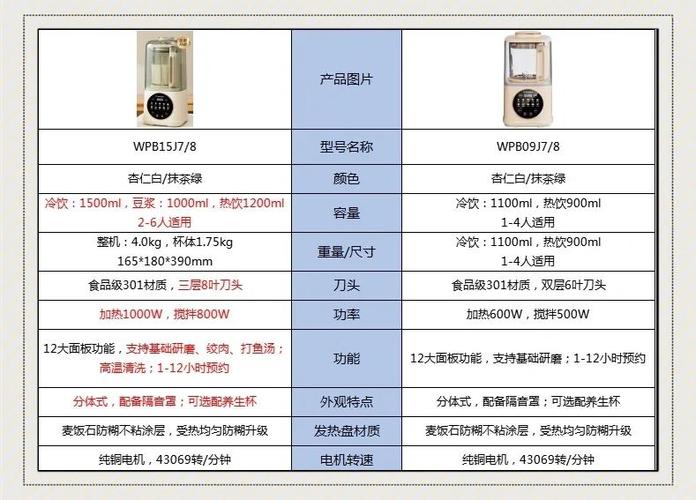〖Four〗、功率/转速:破壁机的主要部件是电机,功率和转速是衡量其性能的重要指标。一般来说,转速越高,食物被打得越细腻。但需注意,并不是功率越大越好,输出功率高且噪音控制得当的才是优选。加热功率一般选取800W及以上,搅拌功率与之相近。刀片材质/形状/数量:刀片的质量直接影响破壁效果。